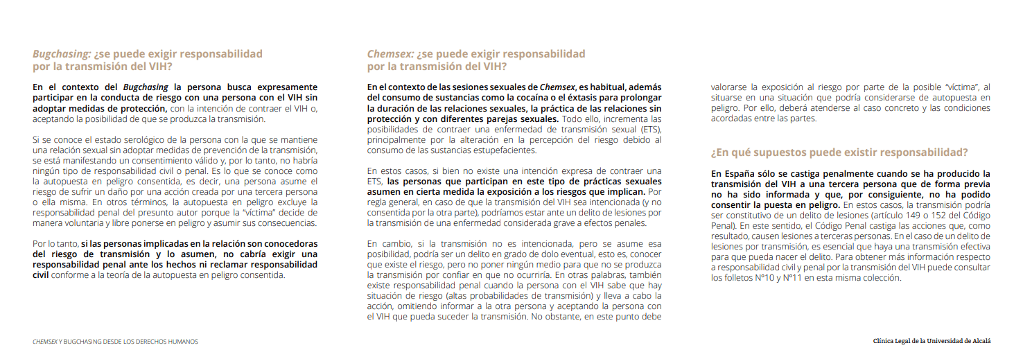 Las prácticas sexuales relacionadas con el consumo de sustancias estupefacientes y conductas de riesgo hacia enfermedades de transmisión sexual (ETS), entre ellas destacan el Chemsex y el Bugchasing, obligan a reflexionar sobre las implicaciones legales que tienen estas conductas y si sería posible exigir responsabilidad penal o civil en caso de que se produzca la transmisión de VIH.