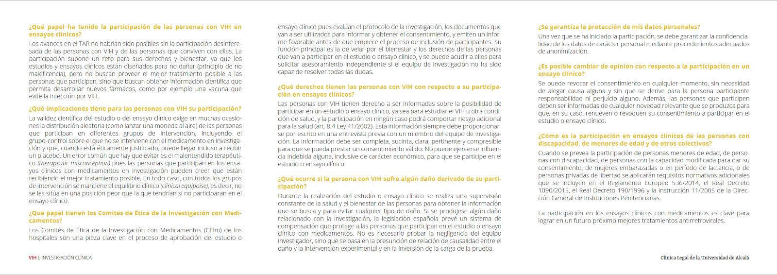 Las personas con VIH tienen derecho a ser informadas sobre la posibilidad de participar en un estudio o ensayo clínico, ya sea para estudiar el VIH u otra condición de salud, y la participación en ningún caso podrá comportar riesgo adicional para la salud (art. 8.4 Ley 41/2002). Esta información siempre debe proporcionarse por escrito en una entrevista previa con un miembro del equipo de investigación. La información debe ser completa, sucinta, clara, pertinente y compresible para que se pueda prestar un consentimiento válido. No puede ejercerse influencia indebida alguna, inclusive de carácter económico, para que se participe en el estudio o ensayo clínico.