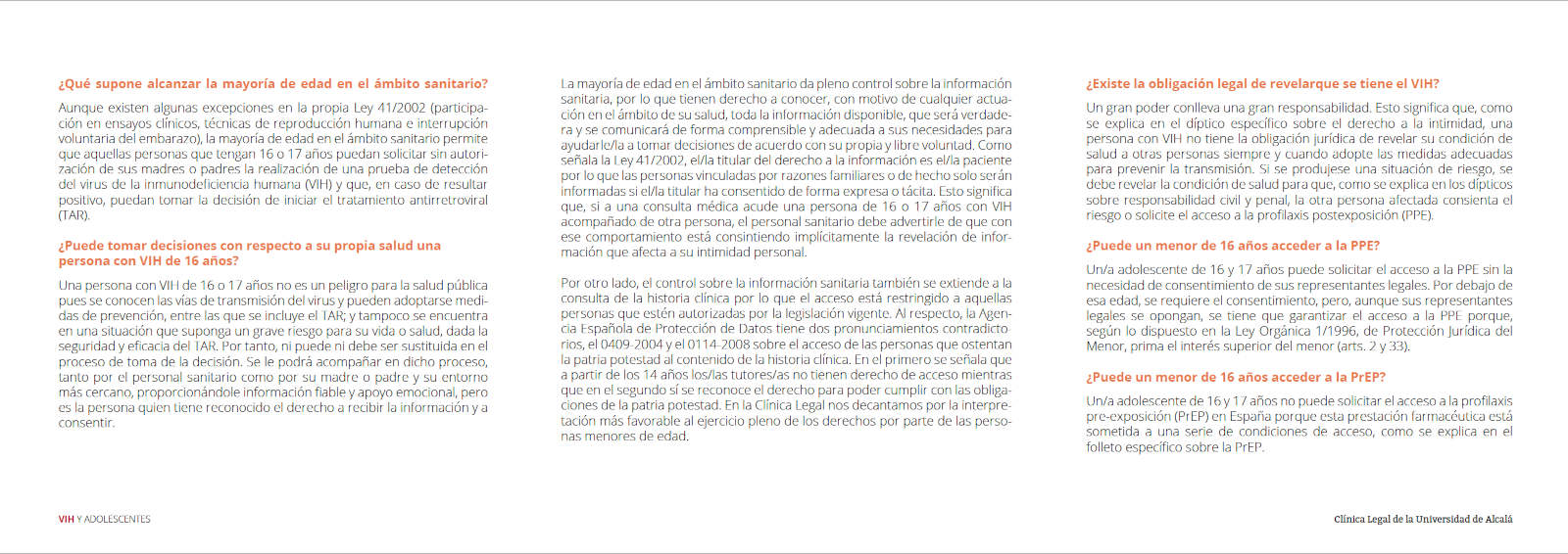 Aunque existen algunas excepciones en la propia Ley 41/2002 (participación en ensayos clínicos, técnicas de reproducción humana e interrupción voluntaria del embarazo), la mayoría de edad en el ámbito sanitario permite que aquellas personas que tengan 16 o 17 años puedan solicitar sin autorización de sus madres o padres la realización de una prueba de detección del virus de la inmunodeficiencia humana (VIH) y que, en caso de resultar positivo, puedan tomar la decisión de iniciar el tratamiento antirretroviral (TAR).